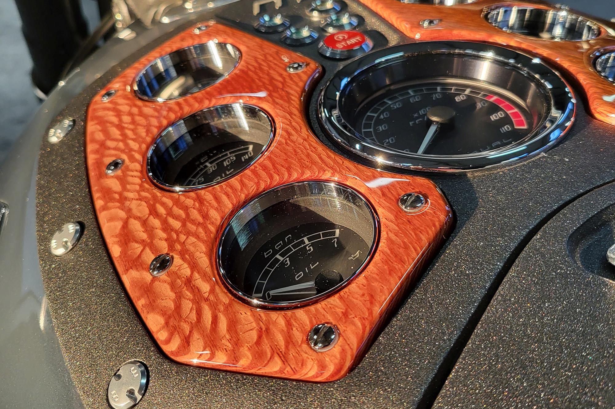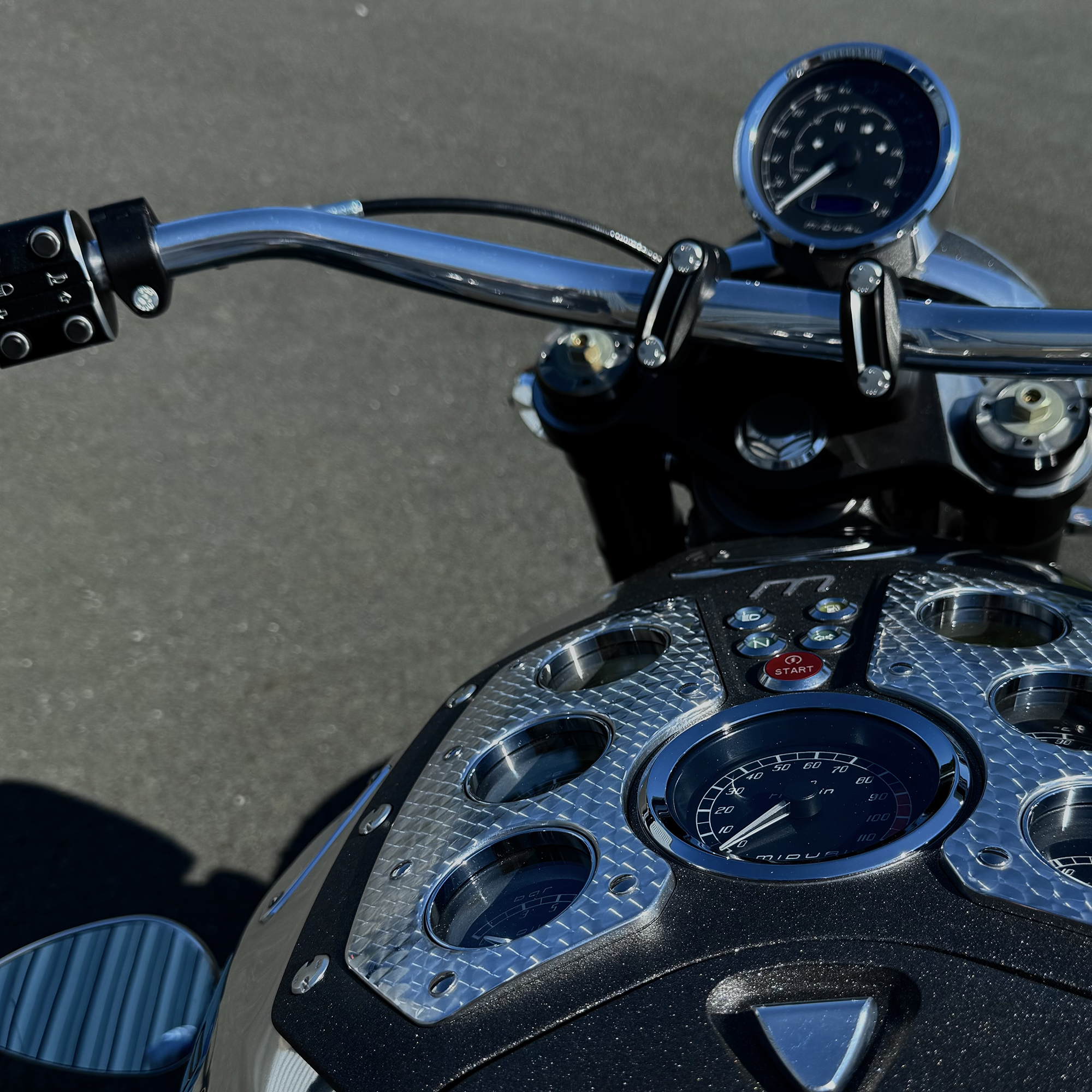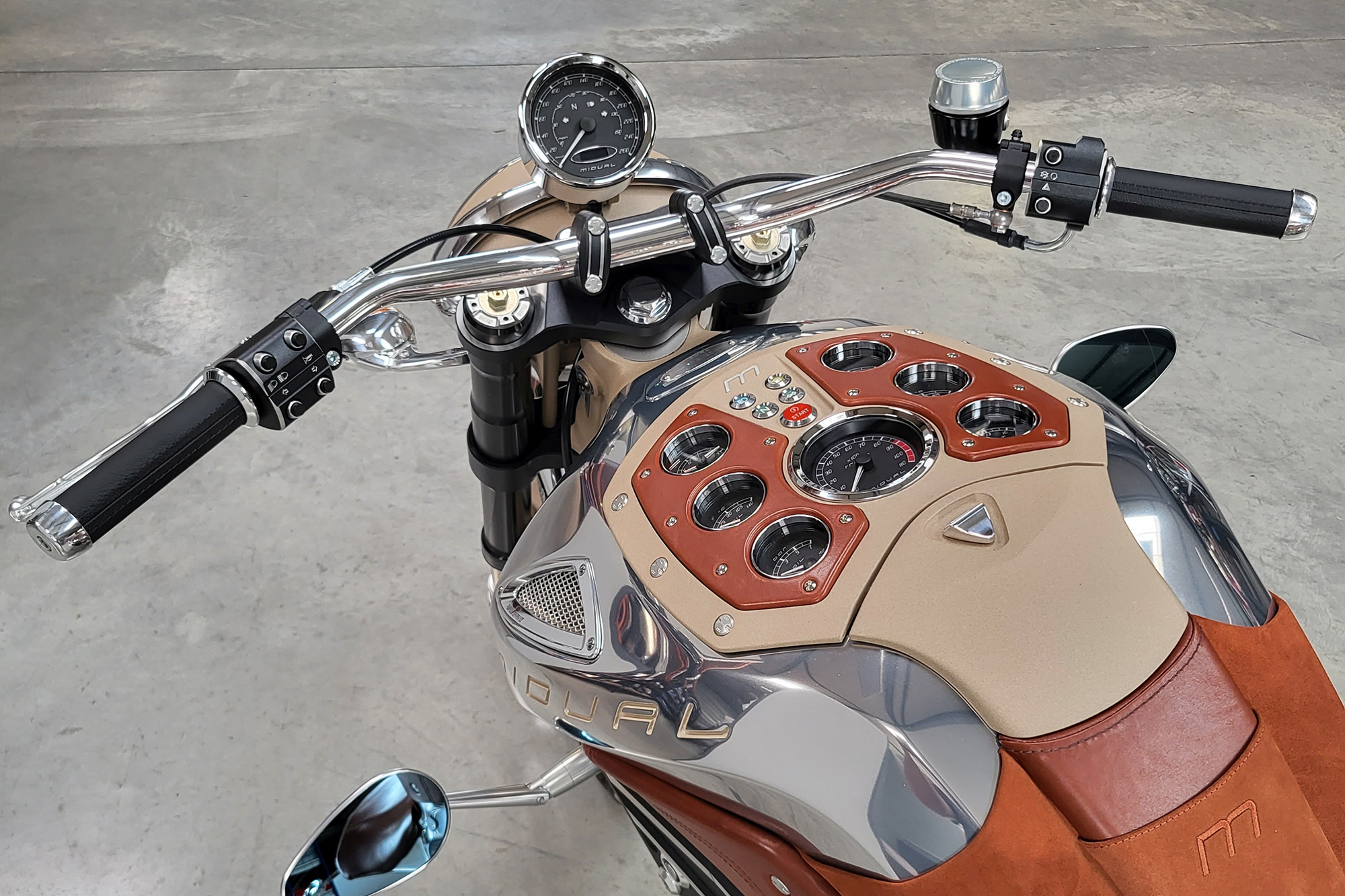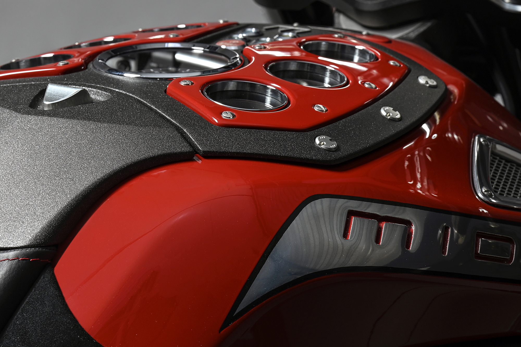 The client chooses the type of finish for the monocoque (polishing, brushing, lacquering, sandblasted coating), the “counter-colour” of the engine and the motorcycle, the leathers and the dashboard finishes.