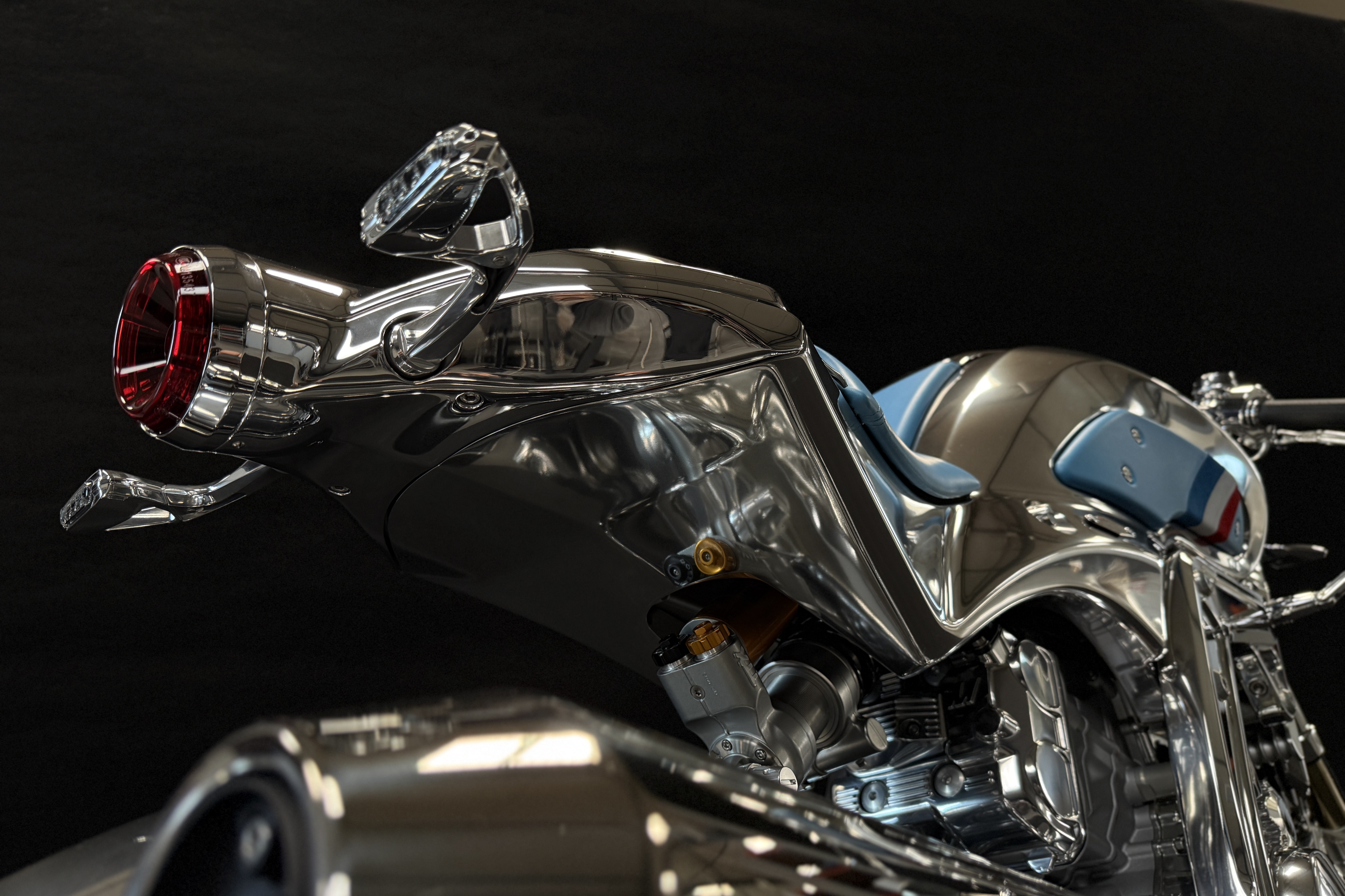 Équipée de guidons bracelets, elle reçoit un inédit et très minimaliste carénage.
