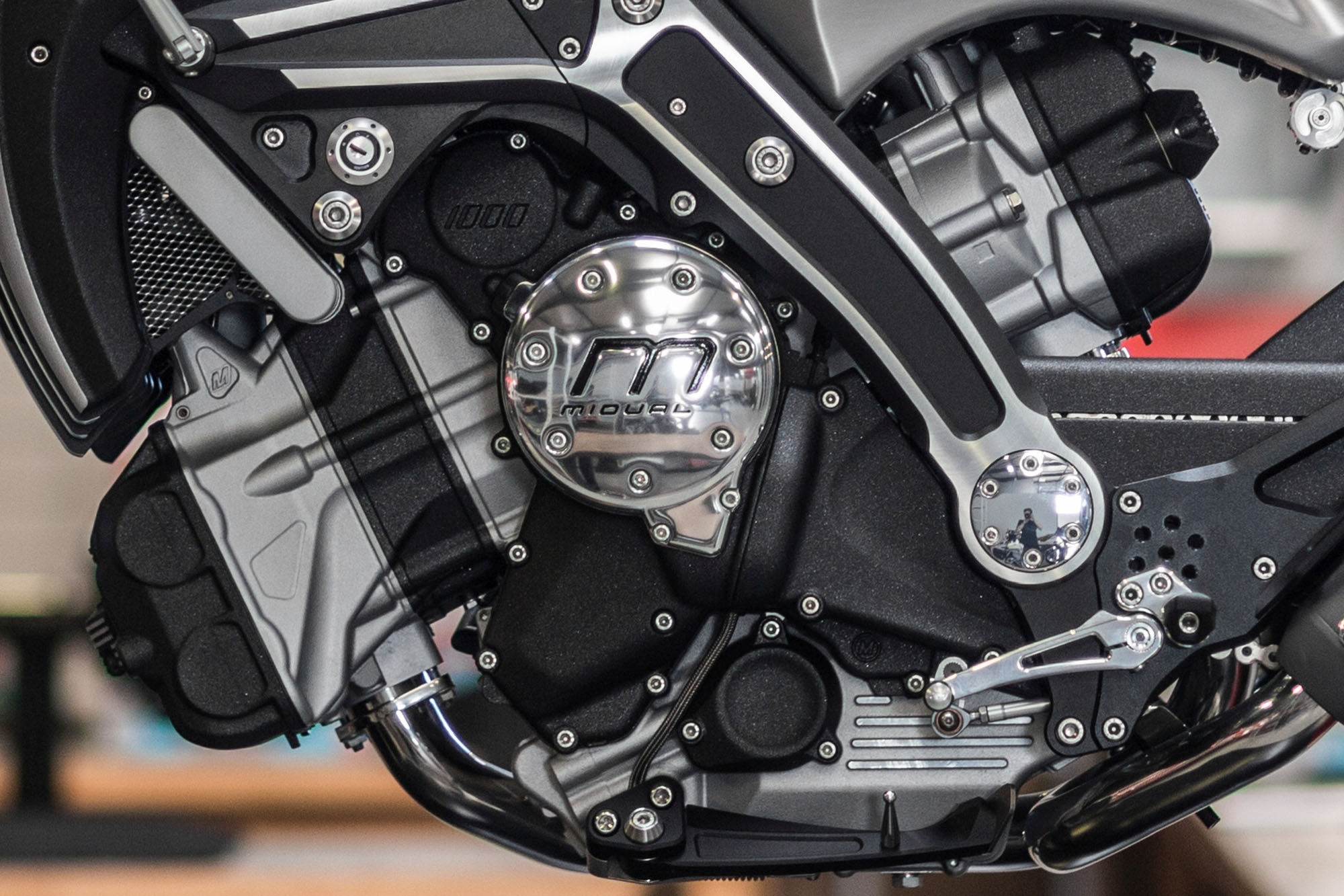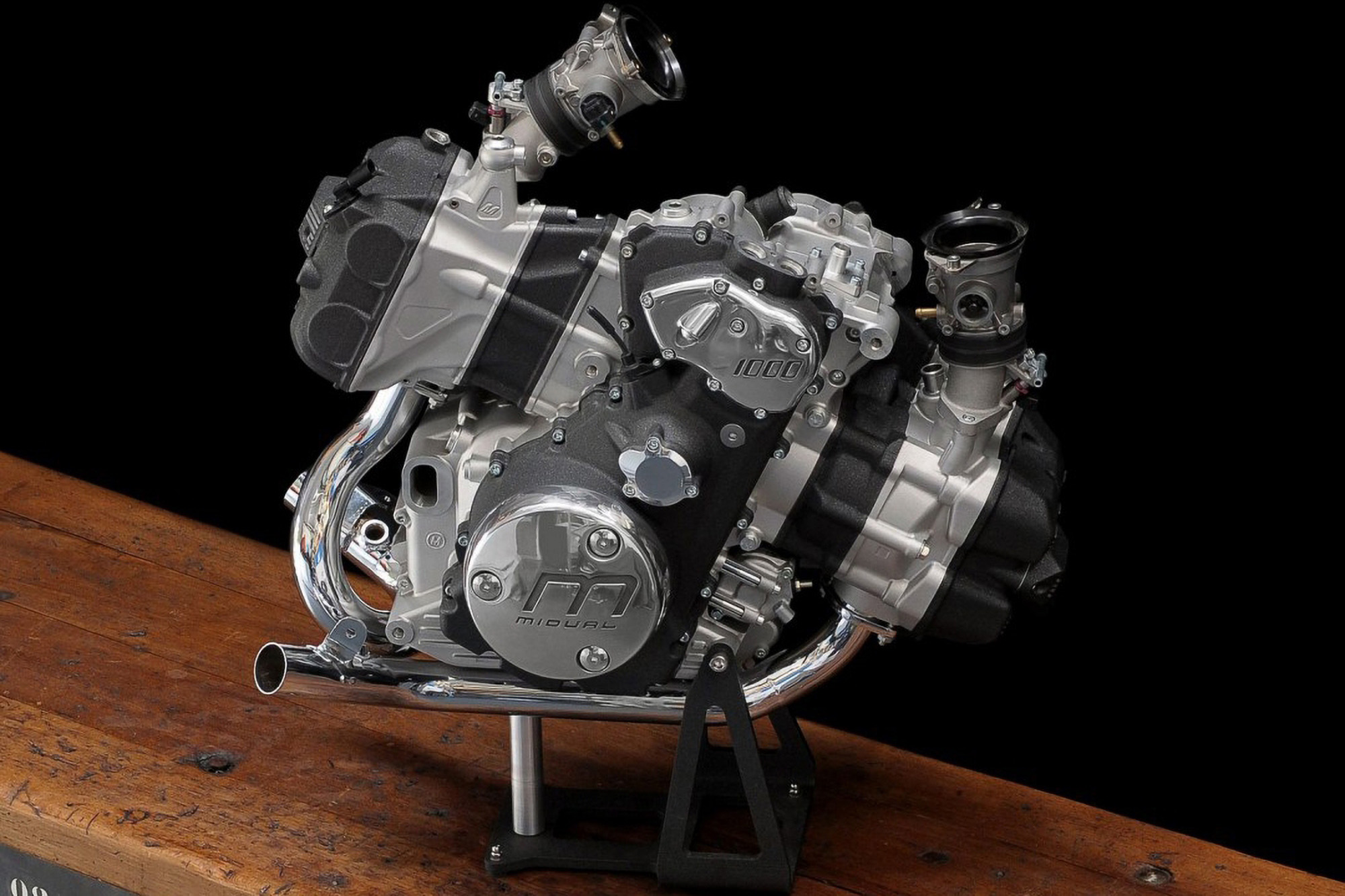 La Midual est équipée d’un moteur flat-twin dans le sens de la route, à vilebrequin transversal. Afin de rendre compatible ce type de moteur avec une géométrie moderne de châssis, le moteur est incliné de 25°, le cylindre avant plongeant vers le sol. Le moteur est ainsi plus court et il est possible d’installer un grand radiateur au-dessus du cylindre avant, tout contre la roue, tout en ménageant la place pour le corps papillon avant. La boite de vitesse est sous le cylindre arrière, l’arbre secondaire étant en position idéale pour la construction d’un bras oscillant long, garant d’un bon comportement routier. Cette définition a permis d’avancer suffisamment le vilebrequin pour charger la roue avant (répartition 49% AV 51% AR). Le tout est très étroit et permet des inclinaisons importantes et une bonne aérodynamique. Concernant la construction proprement dite, les valeurs d’alésage course sont de 100 X 66.