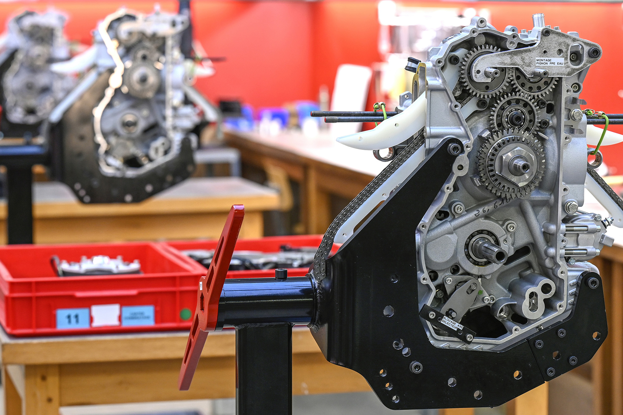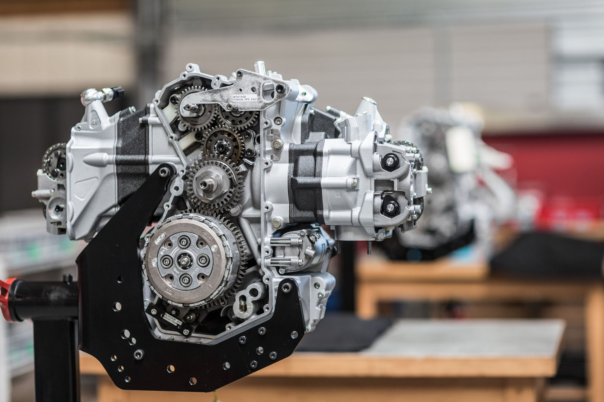 Le carter moteur à plan de joint vertical renferme une boite 6 vitesses et un embrayage anti dribble, entrainé par une transmission primaire à taille droite, à rattrapage de jeu.