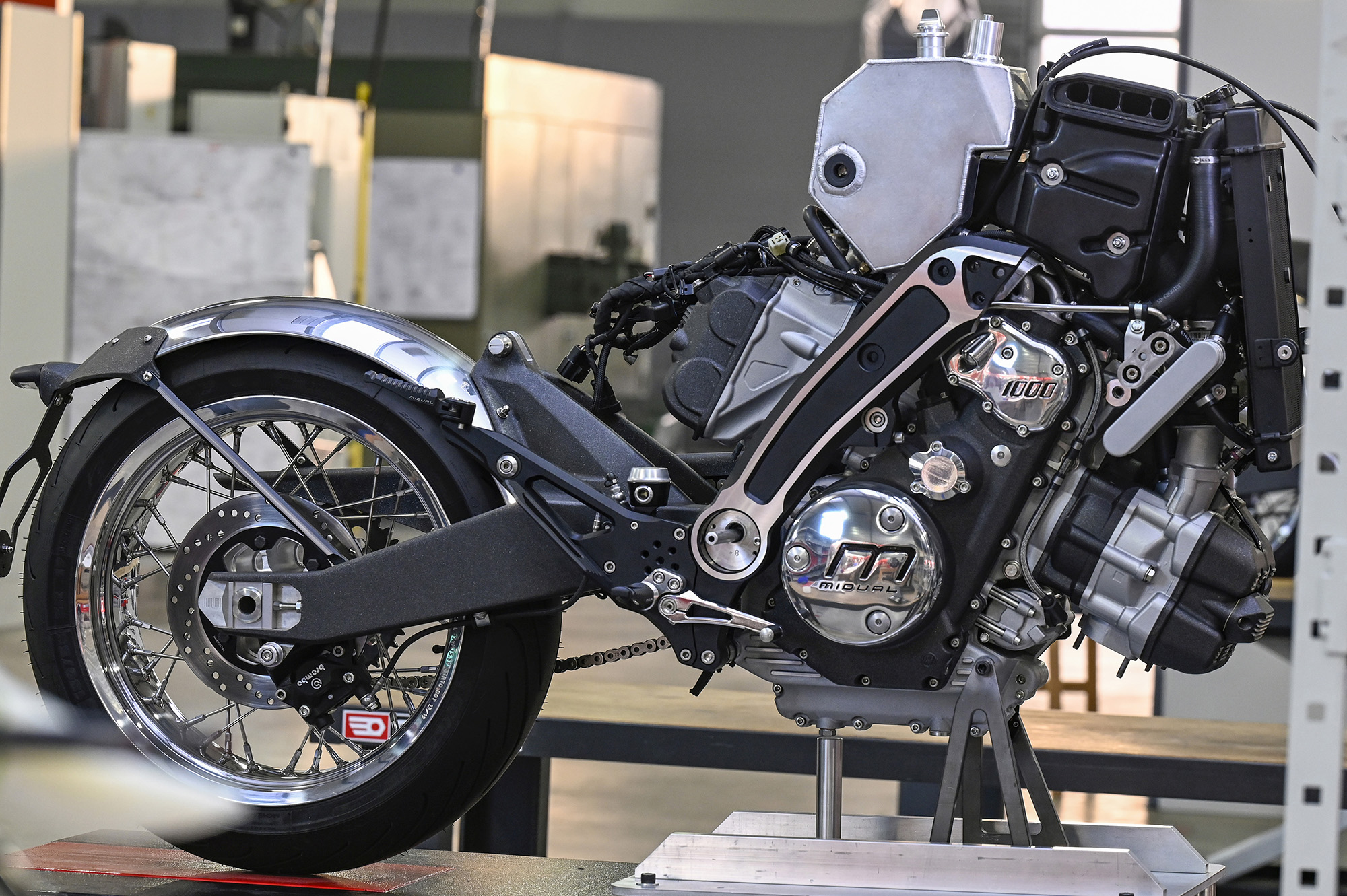 Monté dans le sens de la route et basculé de 25°, le flat twin 1036 cm3 double arbre à cames en tête de la Midual est une proposition unique sur le marché.